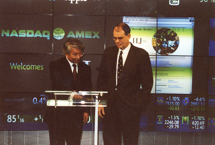 1999年8月にIIJは米国NASDAQ市場に上場。国内市場を経ずにNASDAQ市場への上場を行った初の事例となりました