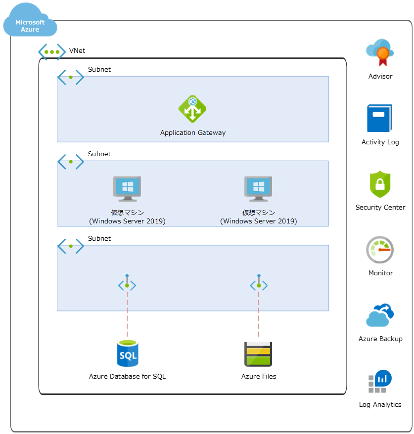 | 導入 | 仮想マシン(VNet、VM) | VMは指定のマシンイメージ起動まで設定 (Azure Backup設定含む) 仮想マシンに対するリソース監視設定 |