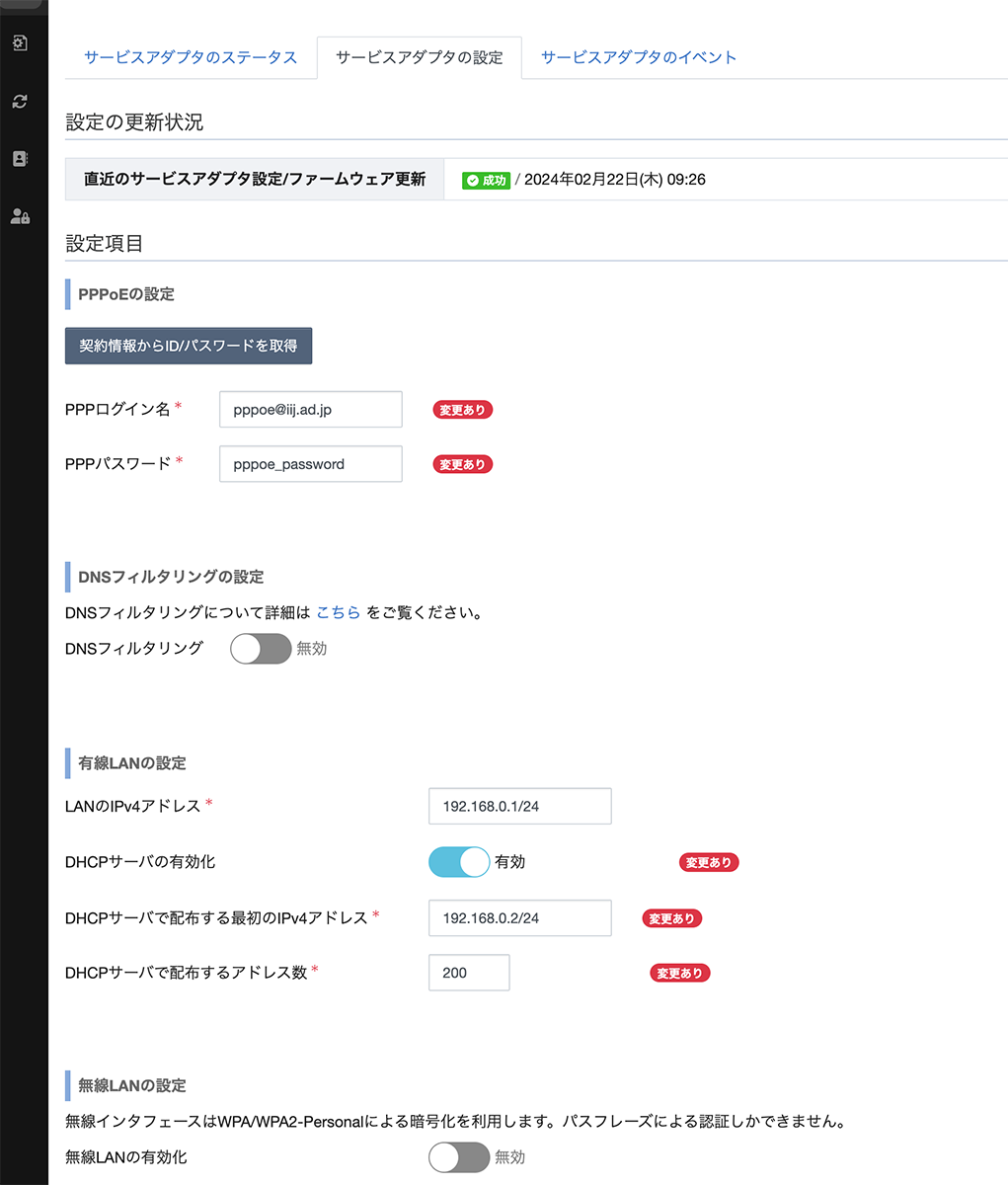 各項目に設定値を登録することにより、サービスアダプタのコンフィグが自動生成されます。