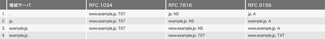 表-1に、www.example.jp.のTXT RRを解決する際の問い合わせ名と問い合わせRR型をまとめます。bowlineは、反復検索としてRFC 9156で定義される「問い合わせ名最小化」のみを用います。表-1のRFC 9156の列を以下で詳細に説明します。