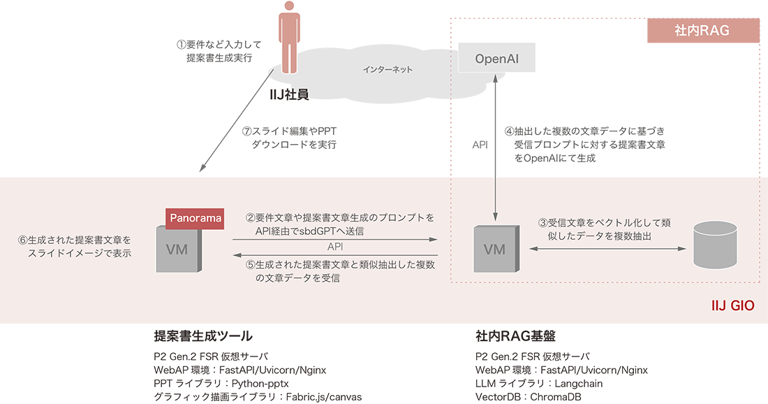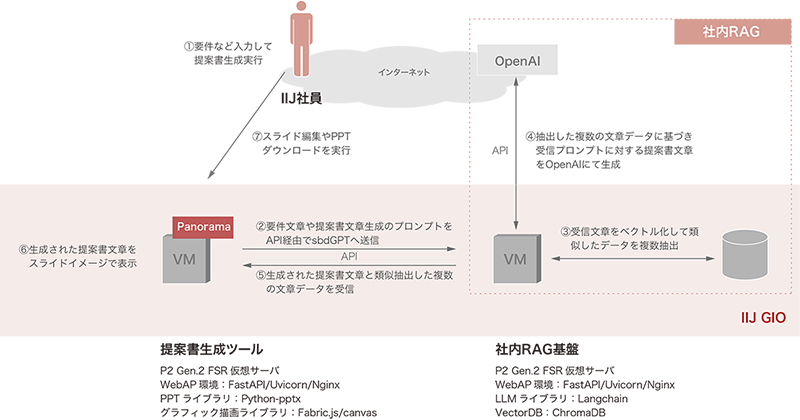 提案書生成ツールは、ユーザがブラウザ上で要件や希望サービスを入力して実行すると、Webサーバが社内RAG基盤のAPIを呼び出し、入力データとシステムプロンプトを基にして最適なサービス提案文面を自動生成させる仕組みを備えています(図-4)。生成結果はスライド単位の構成情報としてJSON形式で処理され、ブラウザ上の編集画面に反映されると共に、プレビュー用のHTML5 Canvas上にリアルタイムで描画されます。描画編集にはfabric.jsを用いており、ユーザはブラウザ上で構成図レイアウトや提案文面を確認・修正しながら、最終的にPowerPointファイルとしてダウンロードできます。