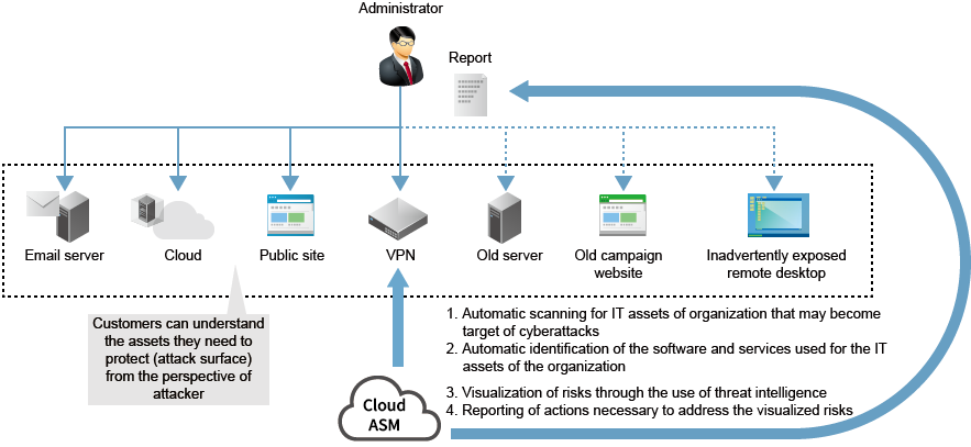 Searches for IT assets via the Internet based on customer domain information and other relevant data. Automatically identifies attack surfaces that may not be fully recognized by the Information Systems Management Department.