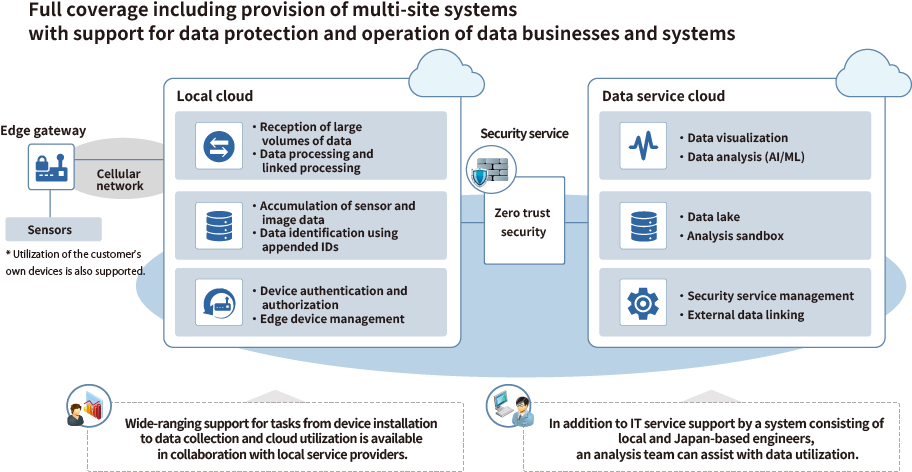 Local cloud services in conformance with local regulations in each country and data service platforms taking into consideration crossborder movement of data are available, as well as data collection, linking, and accumulation necessary for IoT and individually customized functionality necessary for data visualization and analysis.
