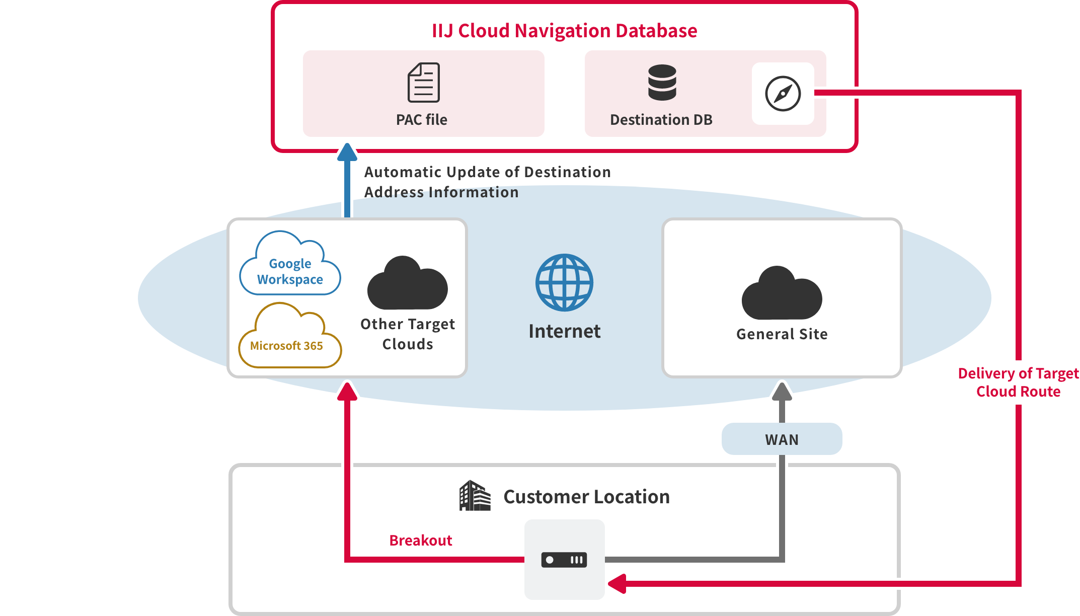 IIJ Cloud Navigation Database is a service that breaks out cloud traffic from the location. This service delivers routes, such as those for Microsoft 365, Google Workspace, and Windows Update, to SD-WAN service locations. Cloud traffic will be directly broken out from the location, avoiding network congestion and achieving comfortable use of the cloud.