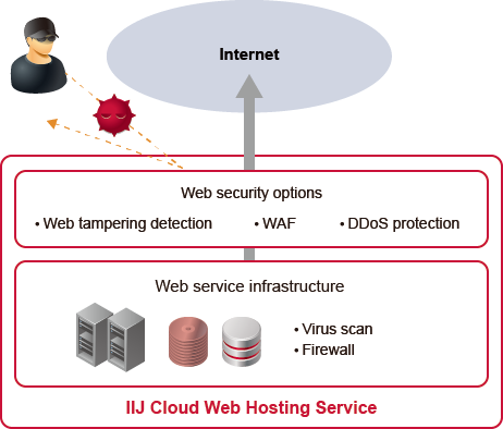 This service provides virus scans and firewalls as standard functions. If the customer adds optional Web tampering detection, WAF, and DDoS protection, security can be further enhanced.