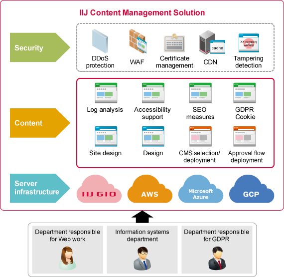 IIJ Content Management Solution provides a one-stop solution for everything required in a website, including CMS deployment, GDPR or cookie regulation solutions, and accessibility support. In addition to robust server infrastructure and web security solutions, it also provides digital marketing consulting to maximize the marketing effect of your website. We can resolve various types of queries and issues for web administrators and lessen workloads to help you achieve business growth.