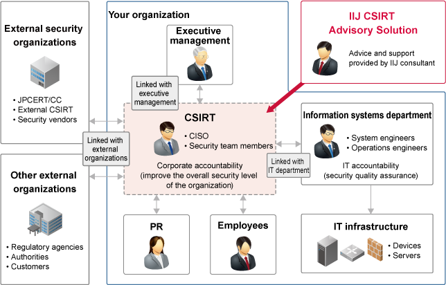 The IIJ CSIRT Advisory Solution is a packaged, fixed fee service that provides initial support in establishing CSIRT in your organization as well as ongoing support after implementation.