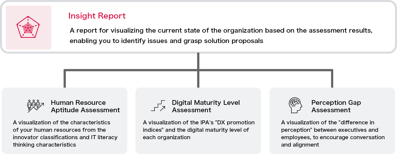 The current state and expectations regarding digital utilization at each organization are assessed based on a fact-finding survey designed with five axes, conforming to the "DX promotion indices" of the Information-technology Promotion Agency, Japan (IPA). The results provide visualization of any gaps and a direction toward improvement.
