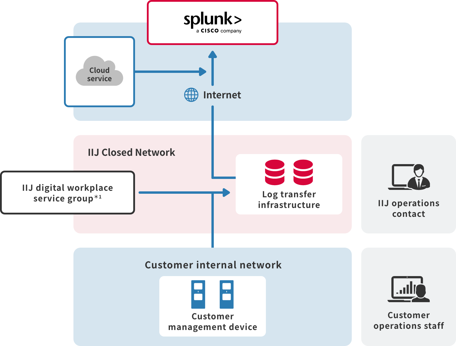 Data captured by the Splunk Cloud Platform can be visualized on the customizable dashboard. Support from a dedicated IIJ engineer is available (for a fee).