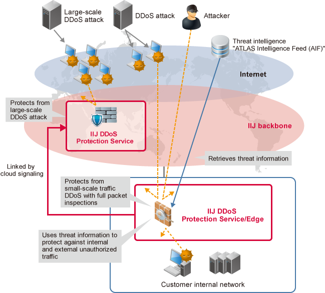 IIJ DDoS Protection Service/Edge is a service where sensors are installed internally at the customer's company to constantly protect customer systems from DDoS attacks and targeted attacks. In addition to conventional DDoS mitigation functions, threat intelligence is used to block not only external attacks, but also malicious internal traffic. And, this service can be linked with the IIJ DDoS Protection Service to protect against large-scale DDoS attacks, too.