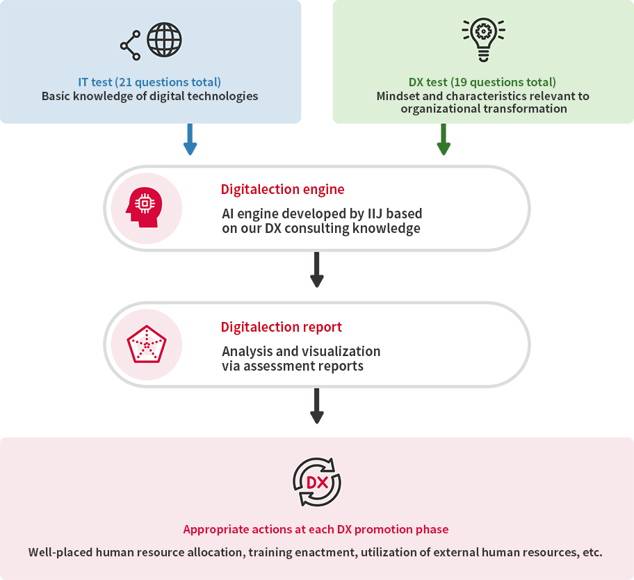 IIJ DX Human Resources Assessment Solution assesses the digital transformation (DX) aptitude of employees through an "IT test" and "DX test." The test results are analyzed with the Digitalection engine powered by AI, and the human resource distribution within the company, as well as persons with high aptitude, are visualized. This clarifies what the next step should be.