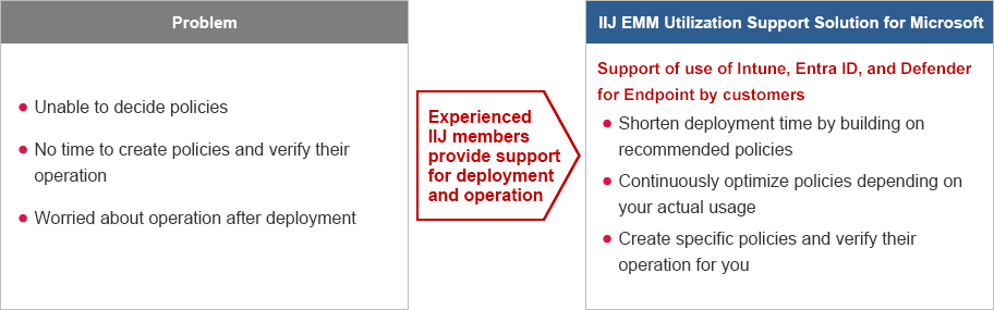IIJ EMM Utilization Support Solution for Microsoft is a solution that examines, creates, and verifies the operation of policies that will become an issue when Microsoft Intune and Defender for Endpoint are implemented and operated. With its extensive experience in implementing and operating Microsoft 365, IIJ greatly reduces the burden on customers and makes end device management and EDR operations easier in the era of hybrid work.