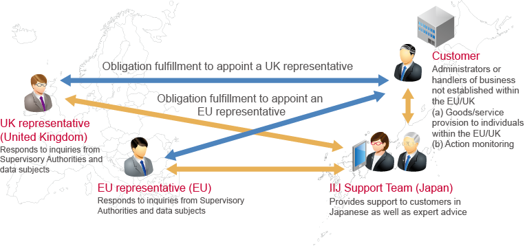If an EU/UK representative is appointed in any of the EU countries or the UK, this representative accepts inquiries from Supervisory Authorities and data subjects. The EU/UK representative communicates with the IIJ team who then discusses the inquiry with the service user in Japanese. The IIJ team receives the content of the service user's response in Japanese and communicates this with the local EU/UK representative. The EU/UK representative provides the actual response to the Supervisory Authority or data subject.