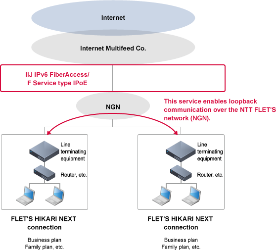 This service enables intra-site communication using the IPv6 addresses allocated for use in the NTT FLET'S network (NGN). This reduces latency to significantly improve the user experience when using VPNs.