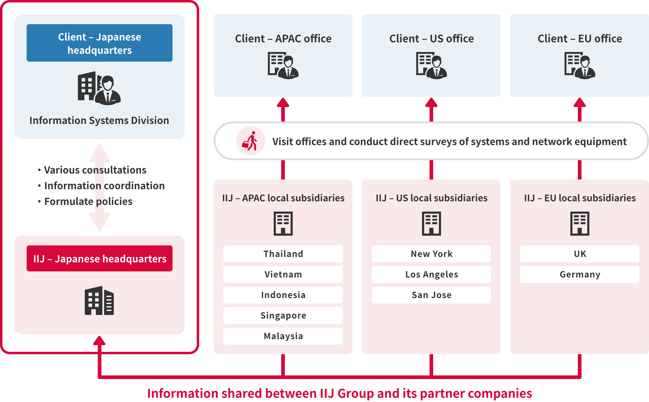 We collaborate seamlessly with IIJ Group's local subsidiaries and international partners. Even in regions where on-site surveys are challenging or have unique circumstances, we make sure to conduct surveys by visiting each location in person.