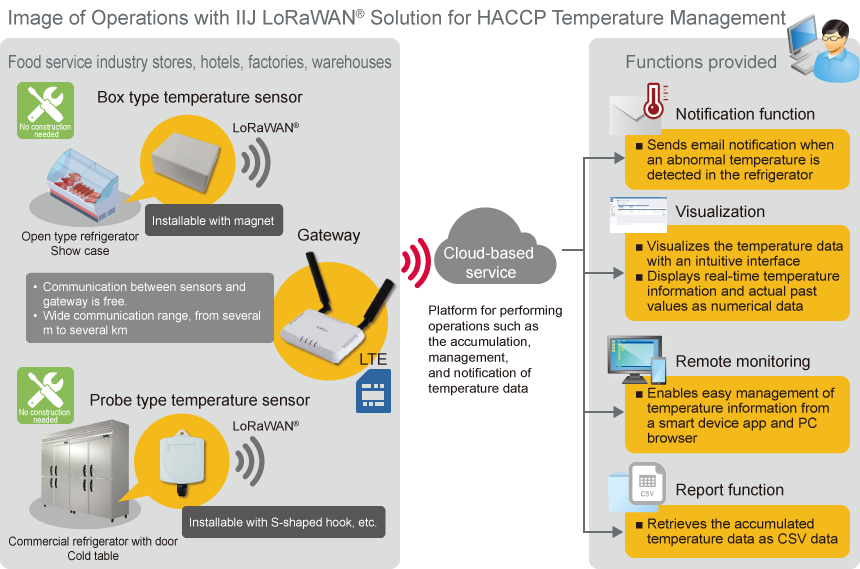 The IIJ LoRaWAN® Solution for HACCP Temperature Management implements the automatic collection of temperature data and the monitoring and notification of abnormalities easily and at low cost at worksites that manufacture, store, sell, or provide food.