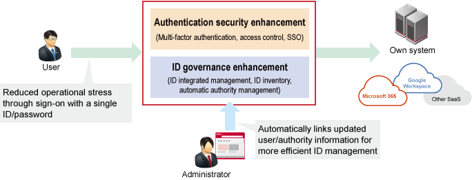 We provide a wide variety of freely combinable features that are required for ID management, authentication, and authorization, such as ID inventory, ID life cycle management, single sign-on, authentication control based on the conditions of the end device in use, and multi-factor authentication. This enhances ID governance and authentication security.