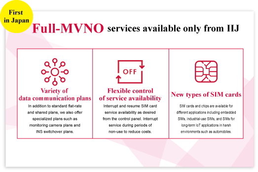 The IIJ Mobile Access Service is a mobile communications service that satisfies the various needs of many types of business customers. IIJ is the first full MVNO in Japan which utilizes the NTT DoCoMo network. This enables us develop unique services more flexibly than conventional MVNOs.