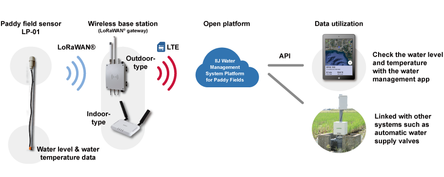 LoRaWAN®, which features unlicensed bands, a radio range of several kilometers, and low power consumption powered by batteries, is adopted. In addition to allowing the connection of multiple paddy field sensors to one wireless base station, it also makes it possible to control the automatic water supply valves and weather sensors of other companies.