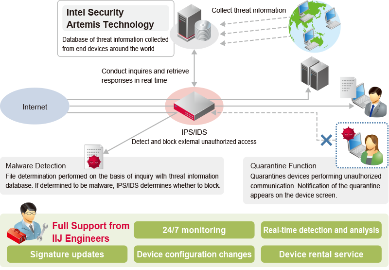 The IIJ Managed IPS/IDS Service detects and blocks unauthorized access to your systems. Robust security through proactive defense against Internet threats.
