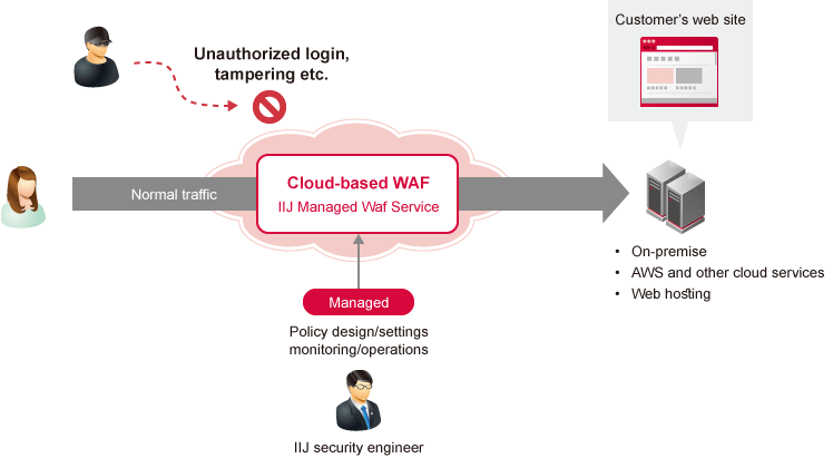 The IIJ Managed WAF Service detects and protects against attacks that exploit various Web system vulnerabilities with a high-performance WAF engine. This cloud-based WAF service is operated by IIJ security engineers and can be deployed for a wide range of Web systems.