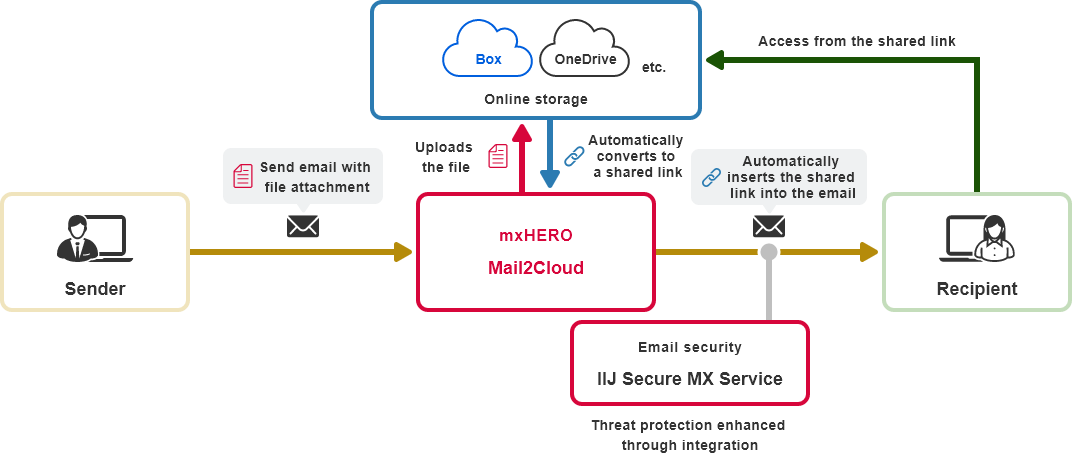 mxHERO with IIJ automatically uploads file attachments to online storage and inserts a shared link into email messages. Furthermore, it supports strengthened governance, such as policy controls and file disabling when sent in error. You can save effort on file transmissions and realize an environment that provides both convenience and security without relying on password-protected ZIP files.