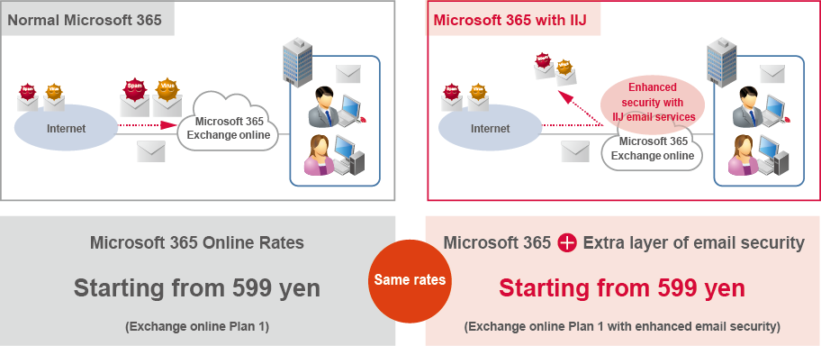 Microsoft 365 is enhanced with IIJ's own email security features. The security features such as erroneous transmission protection (encryption of attachments, etc.) and double protection against viruses and spam can be supported at the original price of Microsoft 365.