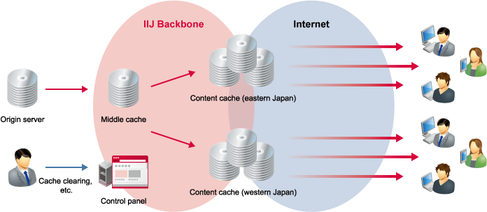 Front cache servers are installed at both east and west locations on the IIJ backbone to ensure efficient delivery of content from anywhere in Japan as well as to provide disaster recovery support.