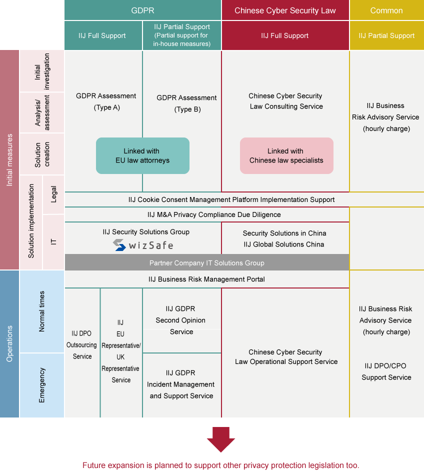As IIJ has deployed our own business globally, we have developed a system for rapid compliance with each country's regulations, and we make decisions about work compliance under this system. We have used this knowledge to provide consulting services to more than 300 companies that represent Japan in the global market. Our deep knowledge at IIJ enables us to provide various solutions for integrated support, from current status analysis and system buildout to the operational phase.