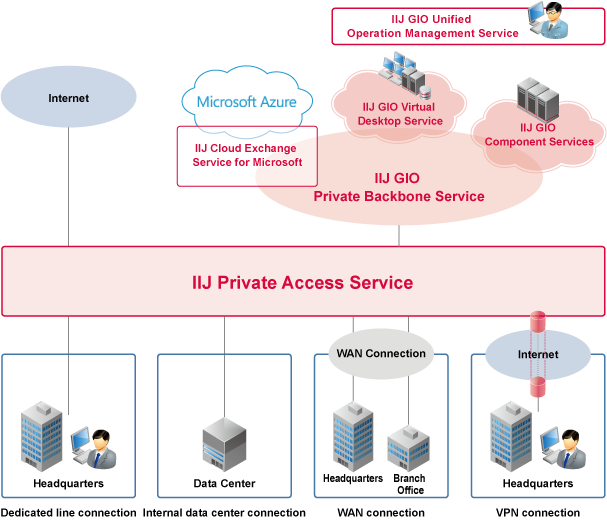 The IIJ Private Access Service is a highly reliable gateway service that connects to the IIJ GIO private backbone and provides access to IIJ GIO and other cloud-based services.
