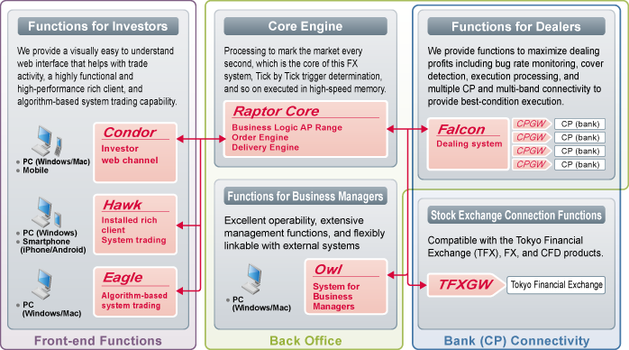 Built on a core engine that utilizes parallel memory processing technologies, this integrated platform provides user functionality designed for excellent usability, advanced business administrator functionality, and trading functionality designed to maximize profits.