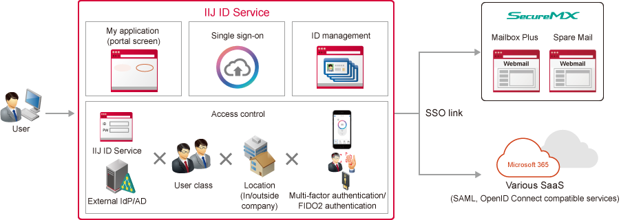 By using the external service linkage option of IIJ ID Service, you can achieve SSO (single sign-on) to various cloud services such as webmail of IIJ Secure MX Service and Microsoft 365.
