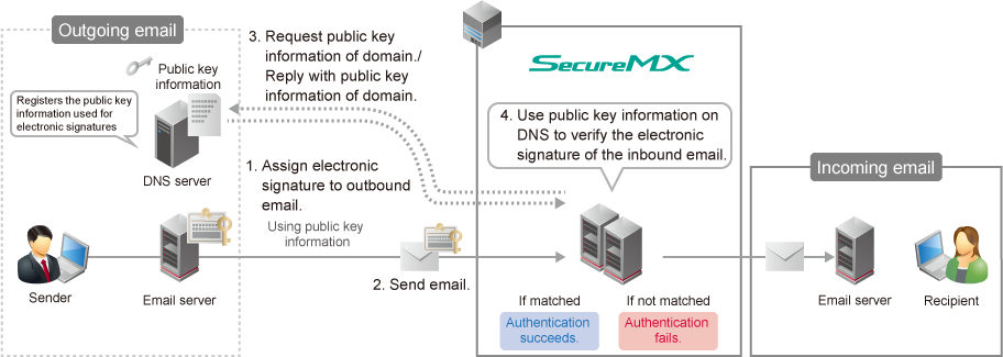 Inspect the electronic signature of the received email and check the legitimacy of the email itself. Also, when sending, you can use a simple operation to add a DKIM signature to all outbound emails.