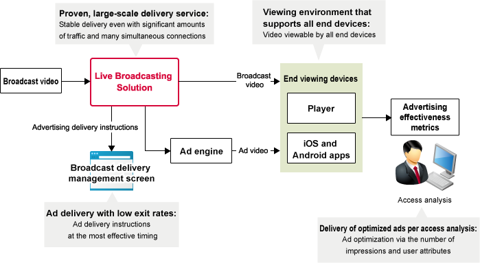 The IIJ Server-Side Ad Insertion Solution inserts video ads into live video feeds. Ads are inserted on the server side so that video ads are delivered stably to end users.