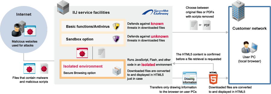 The IIJ Secure Web Gateway Service is a cloud-based service that provides all necessary web security functions. With this service, you can improve business efficiency through optimized web security.