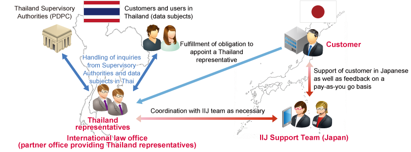 If a Thailand representative is appointed, this representative accepts inquiries from Supervisory Authorities and data subjects. The Thailand representative communicates with the IIJ team, who then discusses the inquiry with the service user in Japanese.