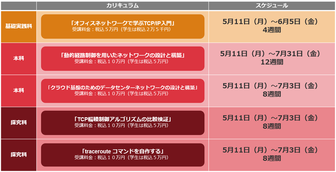 | 基礎実践科 | 「オフィスネットワークで学ぶ TCP/IP 入門」 | ○ | - |