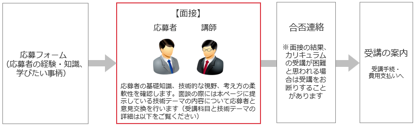 また、以下に提示する「技術テーマ」について意見交換をさせていただきます。意見交換は実際の受講での適切なカリキュラムの進め方を検討するために行います。カリキュラムの内容に加えて、強化するのが望ましい分野や課題がある場合に、それを踏まえた進め方を用意しておくことで、学習をよりスムーズに進められるようになると想定されるからです。