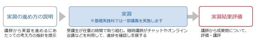 受講生は基本的に任意の時間で課題に取り組みます。適宜、講師がチャットやオンライン会議などを利用して実習の進捗確認および受講生の質問に答える時間を設け、フォローを実施します。講師とのコミュニケーションは原則、当社営業日(※)にチャットやオンライン会議等で実施します。受講生が希望する場合は、スケジュール調整のうえ教室(飯田橋グラン・ブルーム内)で対面指導を受けることも可能です。