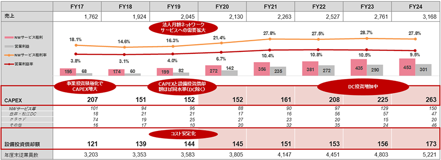 当社グループの主な設備投資は、ネットワーク・クラウド・データセンター等のサービス運営設備やシステムインテグレーション提供にて必要となるお客様向け設備の取得及びソフトウェア開発等です。市場規模拡大を見据え、2017年度以前に設備投資水準を増加して以降、データセンター建設を除く定常的な設備投資は同水準で推移しています。ネットワークインフラは継続的に拡大し、サービス開発にも積極的に取り組んでおりますが、近年は定常的な投資額と償却費がバランスし安定推移しており、当面そのような状況が継続すると想定しております。