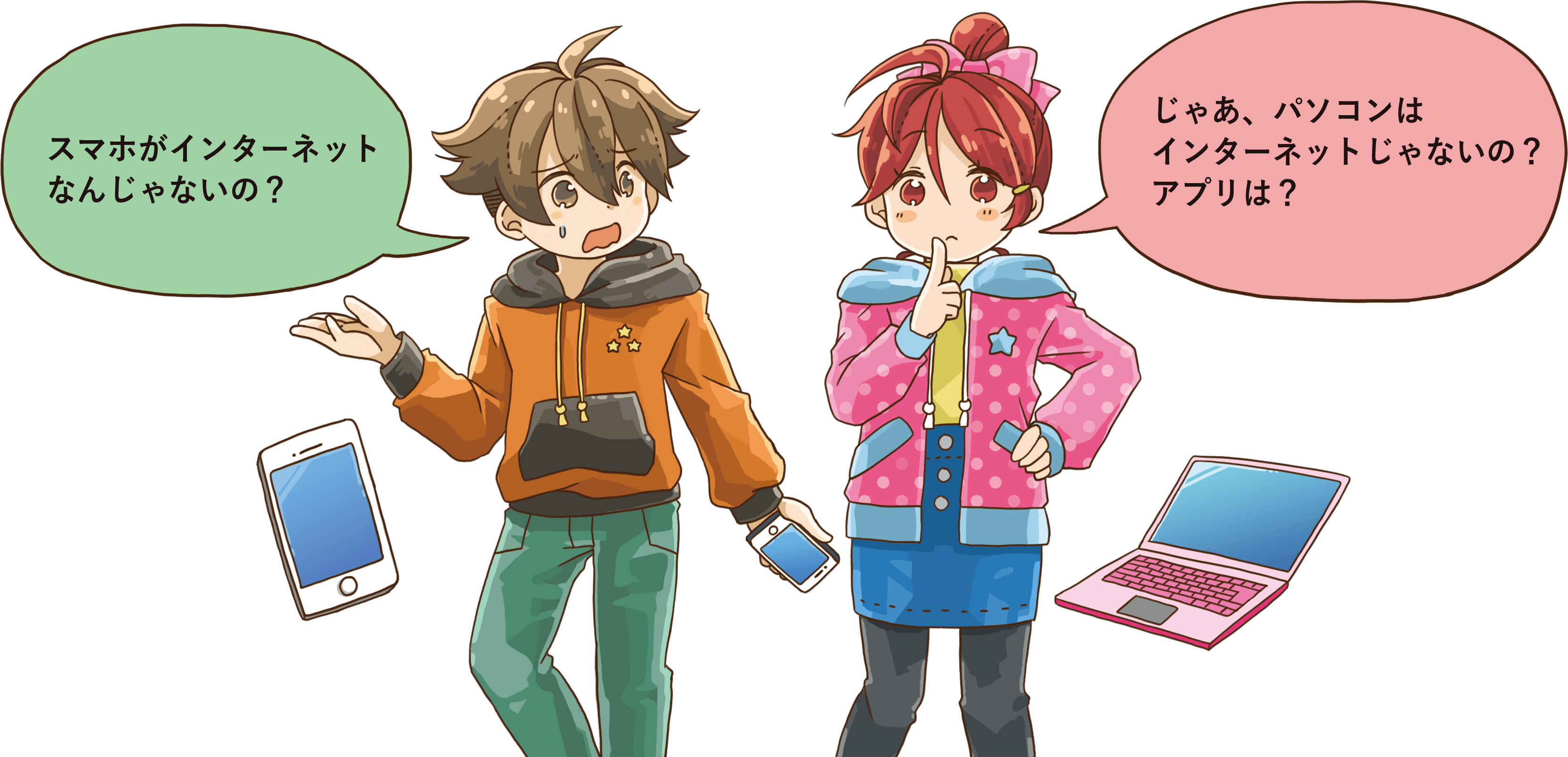 スマホやパソコンは、インターネットにつなぐことができる機械であり、インターネットそのものというわけではありません。インターネットは世界中のコンピュータ同士をつないで情報の交換ができるようにした仕組みのことです
