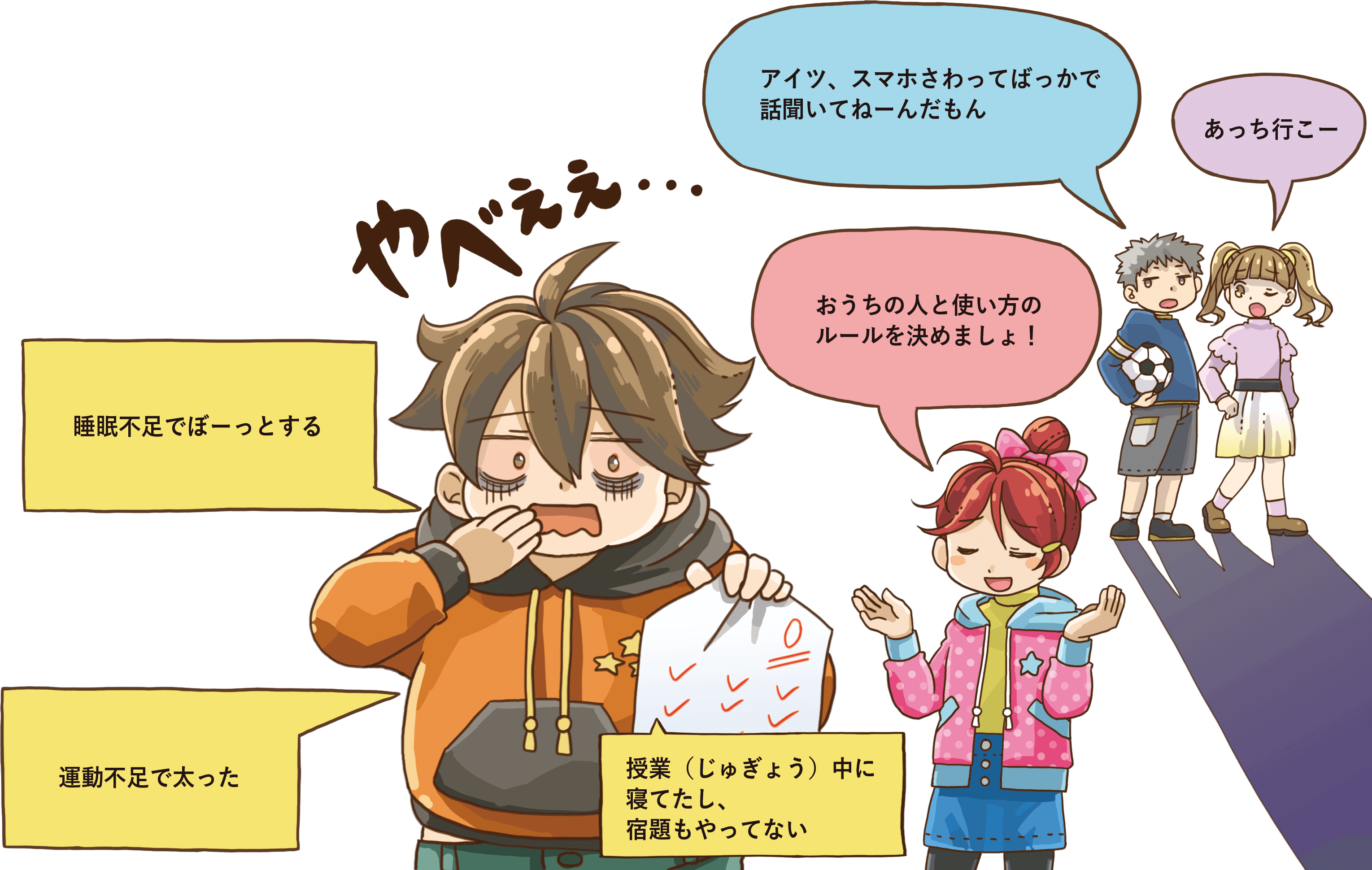 でも、夢中になりすぎると、その分寝(ね)る時間や勉強する時間、友だちと会って外で遊ぶ時間がなくなるかもしれない。睡眠(すいみん)不足で授業中にいねむりするかもしれない。それはいい使い方じゃないよね。おうちの人と相談して、使い方のルールを決めることをオススメするよ!