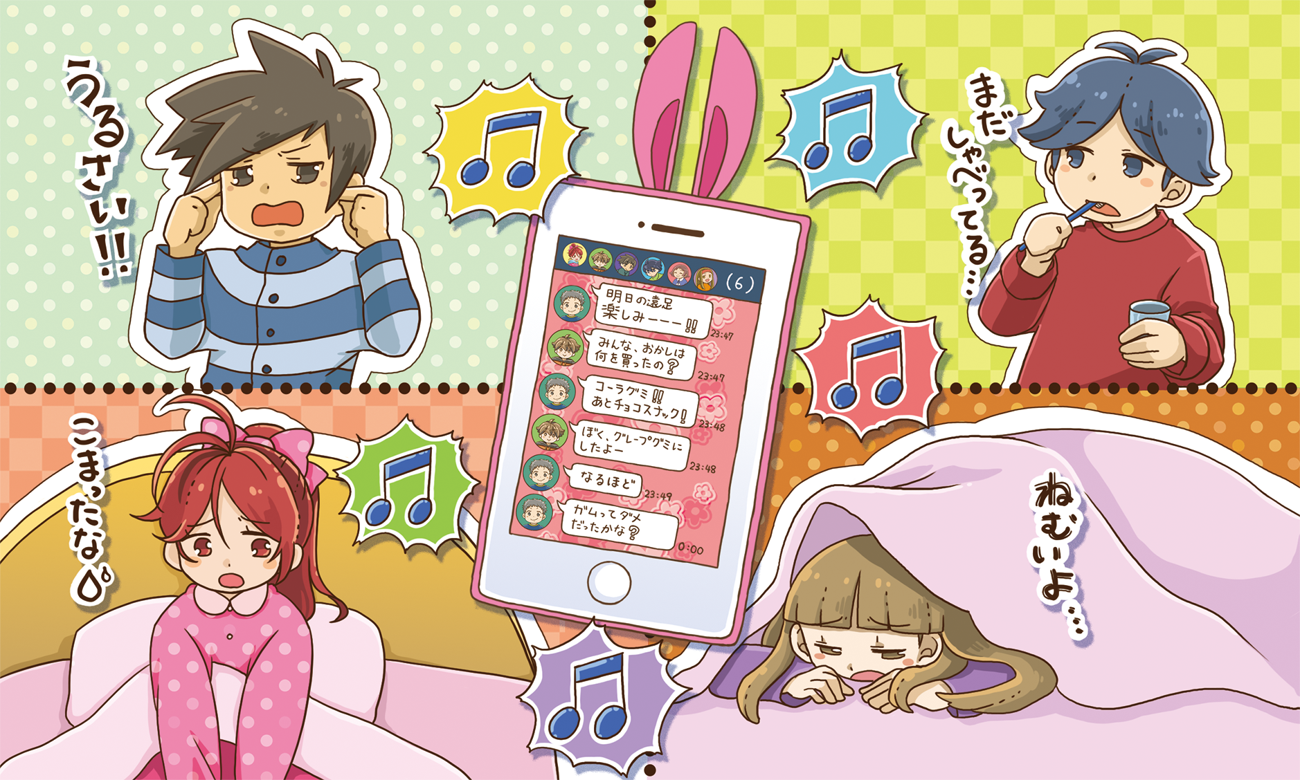 実際にお子さんにスマホを持たせた方から、「子供が夜中までグループチャットなどでメッセージのやりとりをしている」という話を聞くことがあります。メッセージを送られた側の子にしてみると、すぐに返信をしないと「既読スルー」だと言われて非難されるんじゃないか、あるいは相談ごとをされているのに「眠いから寝る」というのも相手に悪いのではと考えたり、自分がスマホから離れたあとみんなが何を話すのか気にしすぎたりと、彼らなりに色々と思うところがあるようです。