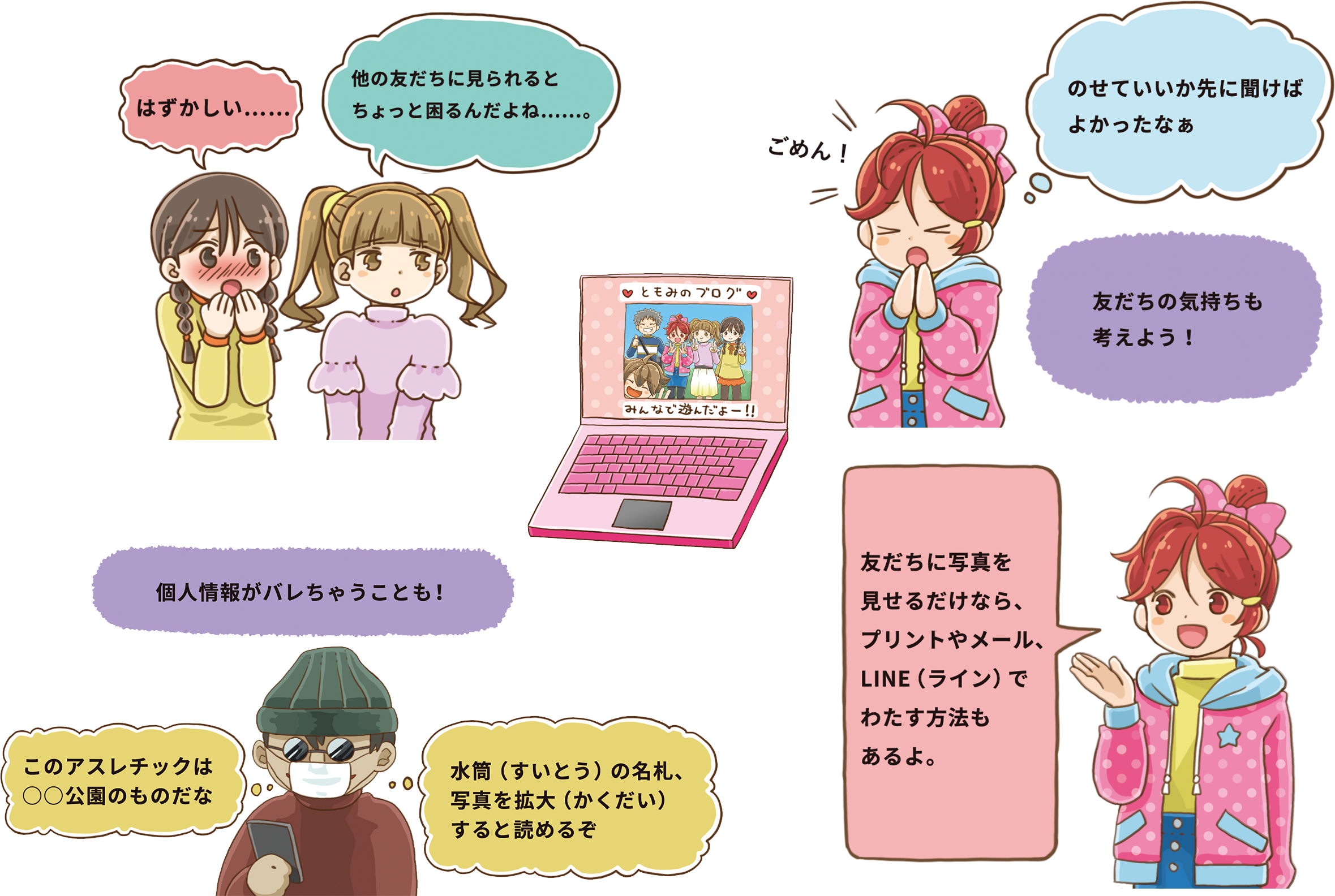 みんなで写っている写真をインターネットに出す時は、まず写っている人全員に「のせていい?」って確認(かくにん)を必ずとるようにしよう。他の友だちに見られたらこまるとか、インターネットに出すのはちょっと……っていう子もいるかもしれないよ。