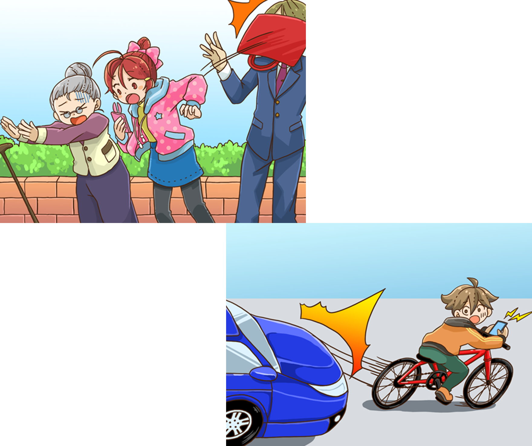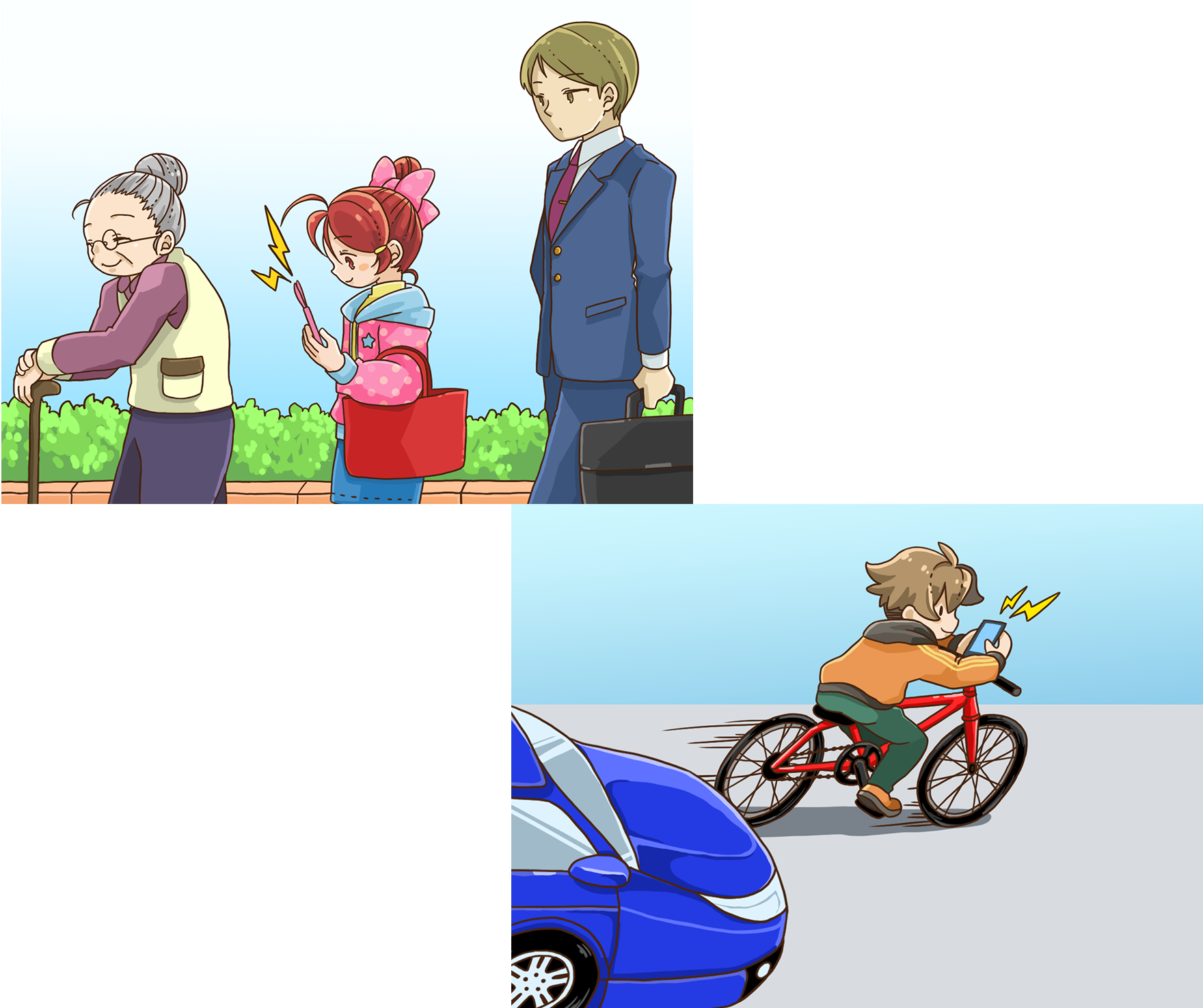 道ばたで、ちょっとした返信やゲームのためにスマホを使うことがあるかもしれない。だけど、歩きスマホや自転車スマホが原因で事故にあったり、ケガをしたりする人はとても多いんだ。自分では「周りもちゃんと見えているからだいじょうぶ」と思うかもしれない。でも、実際の実験から、スマホに視界(しかい)をうばわれ、ふだんより周りが見えていなかったり、歩き方や運転がふらつきがちになったりする、という結果が出ているんだ。自分がケガをするだけではなく、人を電車のホームからつき落としたり、自転車で人をひいてしまったりと、歩きスマホや自転車スマホで大ケガをさせてしまったケースもたくさんあるんだよ。