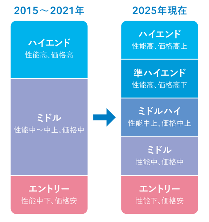 お客さまのニーズはいろいろな理由から日々変化します。2015~21年あたりまでは、為替バランスが良かったこともあり、参入メーカも、投入されるモデルも増加して、チャレンジしやすい市場環境でした。またこの頃はわかりやすく性能別にエントリー、ミドル、ハイエンド・フラグシップという3つのグレードに分かれていました。一方、現在は円安ドル高、物価高などの影響もあって、ニーズがより細分化し、エントリー、ミドル、ミドルハイ、準ハイエンド、ハイエンド・フラグシップという、5つのグレードに分かれてきています。