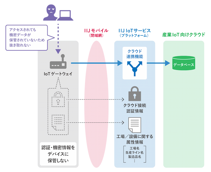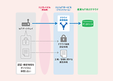 IIoT-SRMでは、IoTゲートウェイ内に機密データを保管せず、クラウド接続時の認証情報や、データ識別に向けたデータ付与(工場名、製造ライン名、製造品名など属性情報)を行なえるIoTプラットフォーム機能を提供しています。これにより、フィールドに設置するデバイスのセキュリティリスクを軽減できます。(図2)