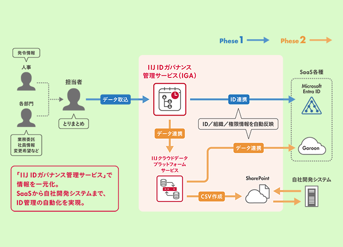 Phase2では、IGAに登録したID情報を、複数システムのデータを連携するiPaaS「IIJクラウドデータプラットフォームサービス」を介して各システムに展開し、APIを使って自社開発システムやGaroonとの連携を進めています。自社開発システムについては、IIJの同サービスで連携情報を取得・加工してCSVを作成し、Microsoft SharePoint Onlineを介して受け渡すことで、日々の運用を自動化しました。段階的に連携範囲を広げられた点も実運用の面で現実的でした。