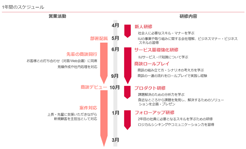 入社してすぐに部署へ配属されるイメージがあるかもしれませんが、IIJでは入社後1ヶ月は新人全員で職種共通の研修を受け、営業職については5月に配属、その後も実務を経験しながら研修が用意されています。