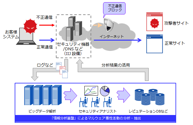 株式会社インターネットイニシアティブでは、このような状況に対し予防措置及び事後対処を講じるために様々な取り組みを検討しています。この検討において、弊社は2016年10月31日のプレスリリースにて"情報分析基盤"の構築に関する発表を行いました(https://www.iij.ad.jp/news/pressrelease/2016/1031.html)。現在、DNSフィルタリングによるマルウェア不正通信ブロックを実施しております。(https://www.iij.ad.jp/sec-statement/)